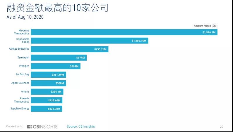 其中,除 Moderna Therapeutics 、Amyris 、Precigen 等公司已成功上市之外,其余 7 家企業(yè)的融資輪次均分布于 D 輪 - G 輪次之間,Zymergen 也于日前對(duì)外宣布完成了 3 億美金的新一輪融資。