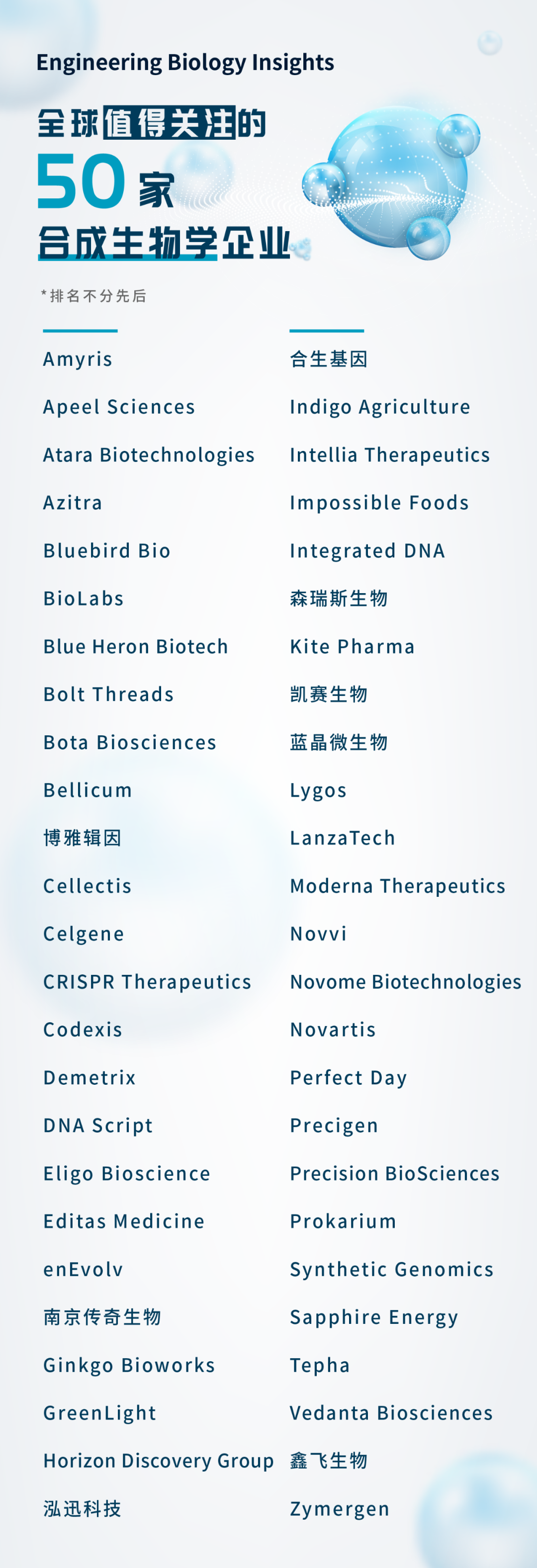 從 CB Insights 的統(tǒng)計(jì)數(shù)中不難發(fā)現(xiàn),從 2015 年開始,大批合成生物學(xué)相關(guān)公司相繼成立。融資階段分布數(shù)據(jù)顯示,2015-2017 年,融資階段主要分為在種子 / 天使輪,3 年平均占比超 35%;而 2018 年至今,融資階段向 A 輪及 B 輪轉(zhuǎn)移,其中 2020 年 1-8 月,B 輪融資占比已達(dá) 33%。隨后,基于 EB Insights 的研究成果,劉炯在會(huì)上發(fā)布了 “全球最值得關(guān)注的 50 家合成生物學(xué)企業(yè)” 榜單,并重點(diǎn)介紹深耕中國(guó)本土市場(chǎng)的公司,在他們用 “上帝之手” 譜寫生命奧秘的背后,變革的巨浪早已奔涌而至。立足中國(guó),為了實(shí)現(xiàn)可持續(xù)性發(fā)展,合成生物學(xué)可以獲得能源、化學(xué)等方面的可持續(xù)產(chǎn)品,也能減少環(huán)境污染。而且更重要的是,合成生物學(xué)是一門新興學(xué)科,雖然目前中國(guó)的生物技術(shù)整體而言還趕不上發(fā)達(dá)國(guó)家,但是對(duì)于早期階段起步的合成生物學(xué),中國(guó)也許能成為這一具有極大潛力的研究領(lǐng)域的主要參與者。以下為榜單中的中國(guó)公司介紹,排名不分先后:關(guān)鍵詞:全球頂尖合成生物學(xué)產(chǎn)業(yè)團(tuán)隊(duì),構(gòu)建計(jì)算驅(qū)動(dòng)的生物鑄造廠上榜理由:Bota Biosciences 成立于美國(guó)劍橋,以計(jì)算為基礎(chǔ)搭建酶工程、菌株工程和發(fā)酵工藝工程平臺(tái),涵蓋酶催化、生物轉(zhuǎn)化和生物全合成三大技術(shù)路徑,通過由云端遠(yuǎn)程操控和自動(dòng)化設(shè)施組成的云端實(shí)驗(yàn)室,可實(shí)現(xiàn)每年 1,000,000+ 通量的菌株構(gòu)建實(shí)驗(yàn)操作、測(cè)試和數(shù)據(jù)收集,為化?、?品、農(nóng)業(yè)和制藥等行業(yè)提供創(chuàng)新產(chǎn)品研發(fā)與大規(guī)模生產(chǎn)解決方案。團(tuán)隊(duì)成員在合成生物學(xué)領(lǐng)域具有多個(gè)產(chǎn)品的成功工業(yè)化經(jīng)驗(yàn)。 關(guān)鍵詞:國(guó)內(nèi)首個(gè) CRISPR 基因編輯療法臨床試驗(yàn)申請(qǐng)?zhí)峤?/strong>上榜理由:基于獲獎(jiǎng)技術(shù) CRISPR 為多種遺傳疾病和癌癥加速藥物研究以及開發(fā)創(chuàng)新療法 。今年,該公司宣布中國(guó)國(guó)家藥品監(jiān)督管理局藥品審評(píng)中心(CDE)已經(jīng)受理其針對(duì)輸血依賴型 β 地中海貧血的基因編輯療法產(chǎn)品 ET-01 的臨床試驗(yàn)申請(qǐng),這是國(guó)內(nèi)首個(gè) CRISPR 基因編輯療法臨床試驗(yàn)申請(qǐng)?zhí)峤弧T-01 的通用名為 “CRISPR/Cas9 基因修飾 BCL11A 紅系增強(qiáng)子的自體 CD34+ 造血干祖細(xì)胞注射液”,通過對(duì)造血干細(xì)胞的合成改造,解決輸血依賴型 β 地中海貧血患者的患病痛苦。關(guān)鍵詞:全球首次利用合成生物學(xué)技術(shù)優(yōu)化、改造的免疫療法用于治療中晚期腫瘤病人上榜理由:中國(guó)首家致力于合成生物技術(shù)在生物醫(yī)藥領(lǐng)域應(yīng)用的高新技術(shù)公司,2020 年 11 月 27 日,基于國(guó)內(nèi)原創(chuàng)的合成生物技術(shù)開發(fā)的首款基因治療產(chǎn)品 SynOV1.1 獲得美國(guó) FDA 臨床試驗(yàn)許可,用于治療包括中晚期肝癌在內(nèi)的甲胎蛋白(AFP)陽性實(shí)體瘤,并計(jì)劃近期在美國(guó)紀(jì)念斯隆?凱特琳癌癥中心(Memorial Sloan Kettering Cancer Center)開展 I/IIa 期臨床研究。這款藥物在中國(guó)的臨床試驗(yàn)申請(qǐng)亦正在進(jìn)行中。將全球第一次將經(jīng)過合成生物學(xué)技術(shù)優(yōu)化、改造的免疫療法用于治療中晚期腫瘤病人。關(guān)鍵詞:讓 DNA 技術(shù)和應(yīng)用更好地服務(wù)生活上榜理由:團(tuán)隊(duì)累計(jì)具有近 50 年的合成生物學(xué)行業(yè)經(jīng)驗(yàn)。目前公司開發(fā)的技術(shù)平臺(tái)為全球領(lǐng)先的合成生物學(xué)完整的 DNA 合成組合平臺(tái) ——Syno®1.0,Syno®2.0 和 Syno®3.0,可以高效應(yīng)用于人源化抗體庫構(gòu)建、基因工程疫苗開發(fā)、工業(yè)酶優(yōu)化、染色體 / 基因組的合成、分子輔助育種以及 DNA 信息存儲(chǔ)的技術(shù)開發(fā)。目前,泓迅科技以 Syno® 合成技術(shù)平臺(tái)為基礎(chǔ)進(jìn)一步設(shè)計(jì)和開發(fā)出先進(jìn)的生物技術(shù)轉(zhuǎn)化及應(yīng)用平臺(tái) —— 泓迅 “GPS” 平臺(tái),該平臺(tái)依據(jù)生物學(xué)最核心的中心法則,在基因型 (Genotype)、表型(Phenotype)基礎(chǔ)上引入了人工合成型(Synotype),利用 “設(shè)計(jì)”、“創(chuàng)建”、 “應(yīng)用” 結(jié)合的方式解讀基因。關(guān)鍵詞:“合成生物學(xué)第一股”上榜理由:被稱為 “合成生物學(xué)第一股” 的凱賽生物主打 “生物法長(zhǎng)鏈二元酸” 系列產(chǎn)品,長(zhǎng)鏈二元酸生產(chǎn)基地于 2003 年實(shí)現(xiàn)產(chǎn)業(yè)化,目前年產(chǎn)能為 40,000 噸,是該產(chǎn)品的全球最大供應(yīng)商。此外,凱賽生物已經(jīng)與杜邦、艾曼斯、贏創(chuàng)、諾和諾德等國(guó)際知名企業(yè)建立起了客戶關(guān)系,其中杜邦(Dupont)近三年以來都是第一大客戶,高性能尼龍瑞士公司艾曼斯(EMS)是其第二大客戶。2019 年,境外營(yíng)收占比為 54.44%,境內(nèi)營(yíng)收的比例則為 45.56%。關(guān)鍵詞:PHA 生產(chǎn)菌株可以實(shí)現(xiàn)月噸級(jí)規(guī)?;慨a(chǎn)上榜理由:藍(lán)晶