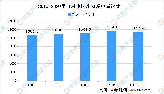 水能是一種清潔能源,指水體的動能、勢能和壓力能等能量資源。水能是一種可再生能源,主要用于水力發(fā)電。我國具有豐富的水力資源,水力發(fā)電是主要電力來源之一。數(shù)據(jù)顯示,2019年我國水力發(fā)電量為11534.4億千瓦時。2020年1-11月我國水力發(fā)電量累計達11378.2億千瓦時,同比增長4.9%。
