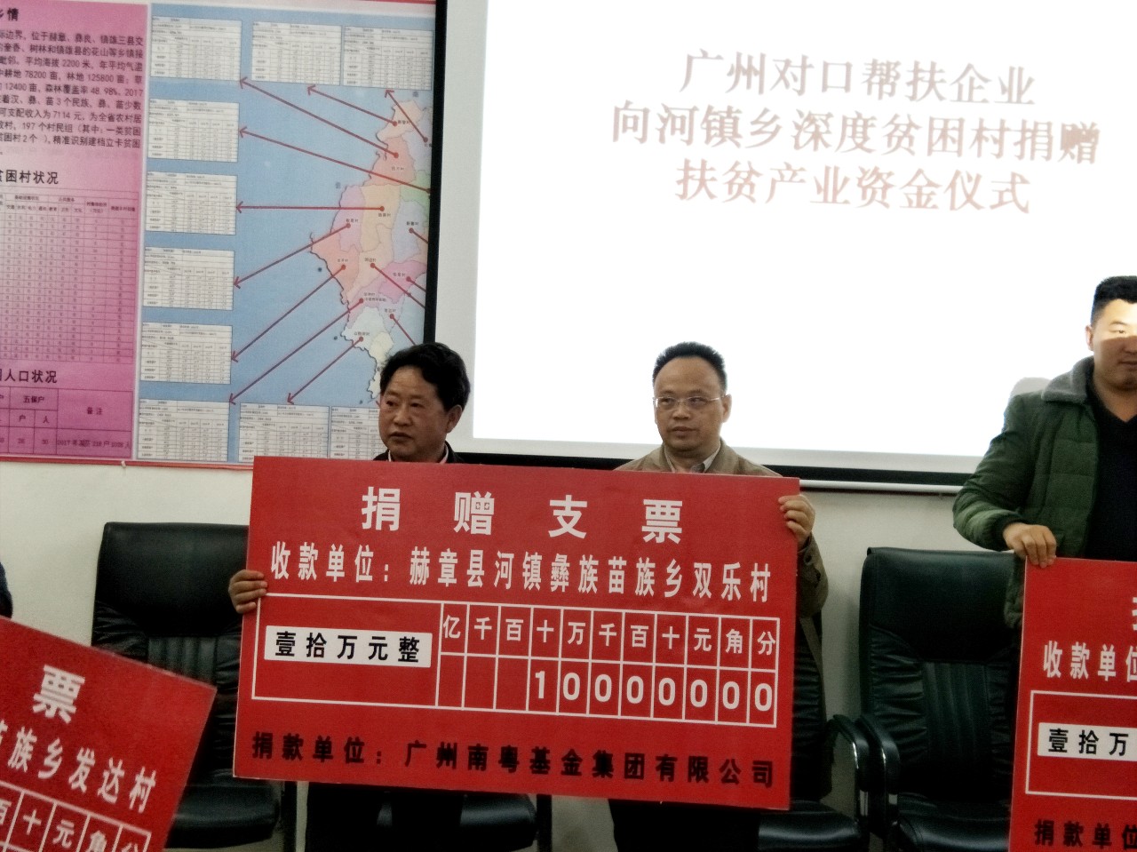 2019年是打贏脫貧攻堅戰(zhàn)極為關(guān)鍵的一年。3月26—28日,帶著廣州南粵基金集團有限公司(簡稱“南粵基金”)董事長林濤同志關(guān)于積極開展精準扶貧工作的重托,帶著集團公司全體員工的濃濃情意,南粵基金副總裁蔣劍鋒赴全國脫貧攻堅主戰(zhàn)場——貴州省畢節(jié)市開展精準扶貧調(diào)研,先后到公司扶貧聯(lián)系點——畢節(jié)市赫章縣河鎮(zhèn)鄉(xiāng)雙樂村以及增城區(qū)扶貧點——黃泥鄉(xiāng)龍?zhí)链宸謩e捐贈了扶貧產(chǎn)業(yè)資金,并參加相關(guān)扶貧攻堅座談會。