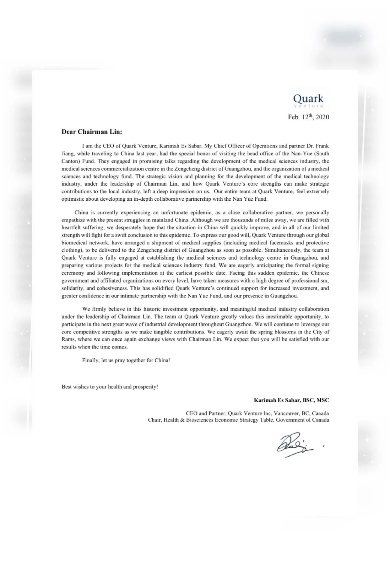 近日,廣州南粵基金集團(tuán)有限公司(簡(jiǎn)稱“南粵基金”)收到一封特殊來(lái)信,寫(xiě)信者是加拿大聯(lián)邦政府經(jīng)濟(jì)戰(zhàn)略委員會(huì)主席、加拿大自然科學(xué)和工程研究國(guó)家委員會(huì)委員、全球健康科學(xué)基金董事會(huì)董事、夸克資本(Quark Venture)首席執(zhí)行官卡瑞瑪沙巴,來(lái)信是為了聲援中國(guó)戰(zhàn)勝疫情并對(duì)南粵基金支援國(guó)家抗擊疫情的義舉和發(fā)展醫(yī)療科技產(chǎn)業(yè)戰(zhàn)略規(guī)劃表達(dá)敬意。