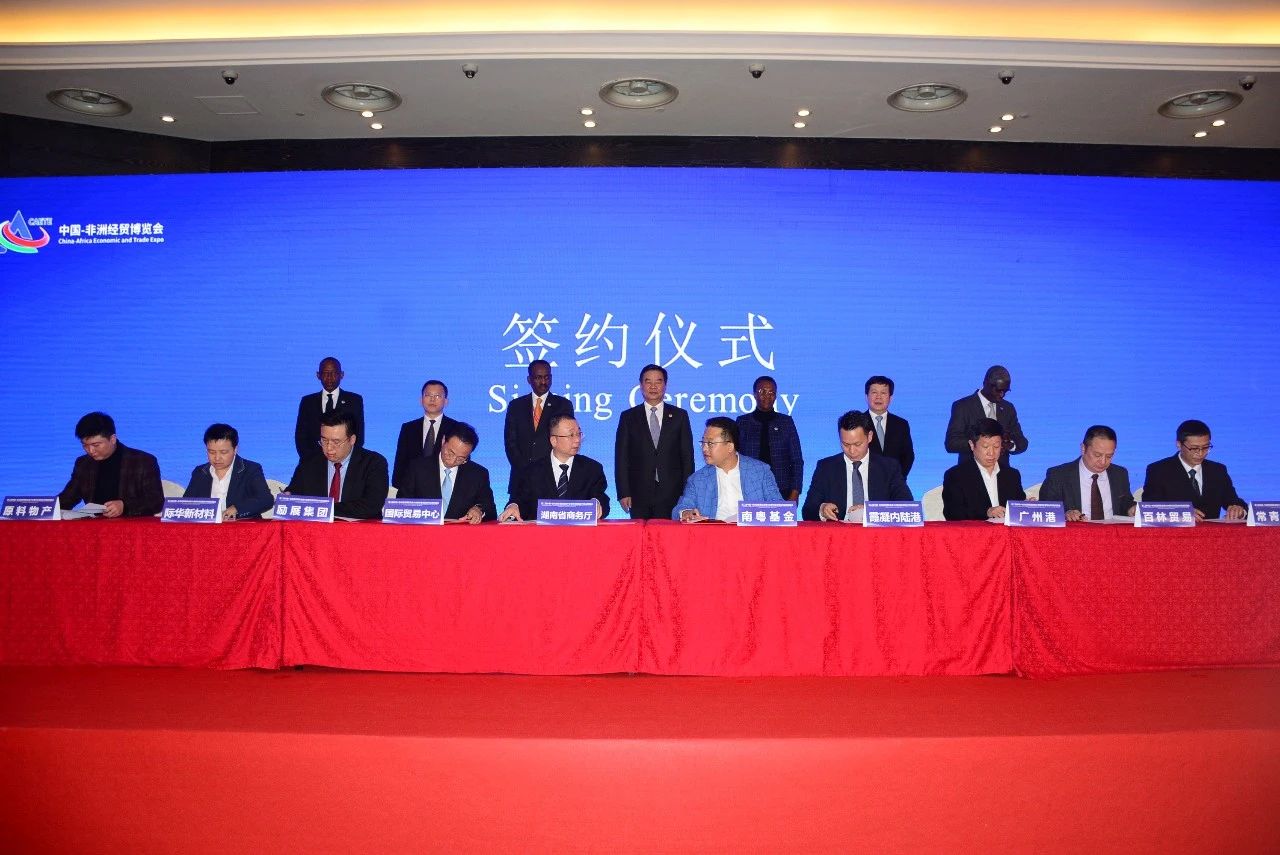 11月5日,第三屆中國國際進口博覽會期間,由商務部和湖南省人民政府主辦的“第二屆中國-非洲經(jīng)貿(mào)博覽會推介會暨對非經(jīng)貿(mào)合作機制對接會”在上海成功舉行。在湖南省副省長何報翔、商務部西亞非洲司一級巡視員謝亞靜、商務部外貿(mào)發(fā)展局局長吳政平、湖南省政府副秘書長陳獻春、湖南省商務廳廳長徐湘平等領導和嘉賓見證下,廣州南粵基金集團有限公司(簡稱“南粵基金”)董事長林濤與湖南省商務廳副廳長李心球代表雙方簽約,共同推動中非在貿(mào)易、農(nóng)業(yè)、制造業(yè)、服務業(yè)、金融業(yè)以及基礎設施等領域深入合作,助力打造中非經(jīng)貿(mào)深度合作先行區(qū)。