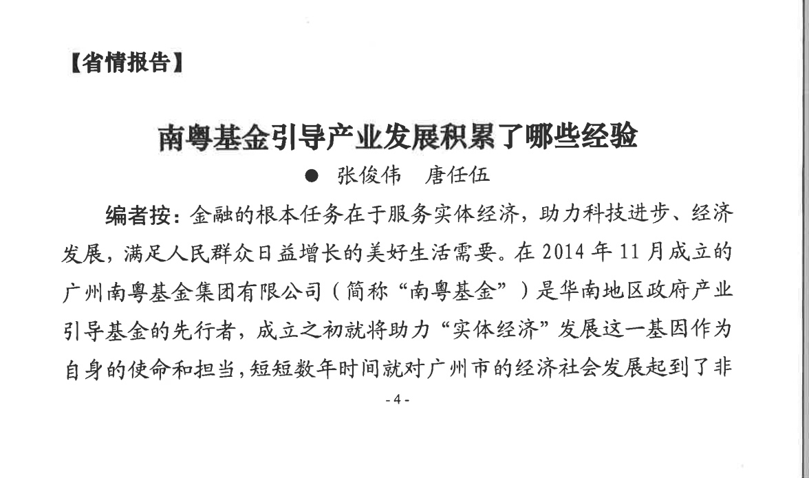 近日,《內(nèi)參》(總第354期)刊發(fā)了專題報(bào)告《南粵基金引導(dǎo)產(chǎn)業(yè)發(fā)展積累了哪些經(jīng)驗(yàn)》,系統(tǒng)總結(jié)了南粵基金在放大政府財(cái)政資金杠桿效應(yīng)、激活社會(huì)資本投資、服務(wù)實(shí)體經(jīng)濟(jì)、推進(jìn)產(chǎn)業(yè)轉(zhuǎn)型升級(jí)等方面的實(shí)踐經(jīng)驗(yàn)。以下為報(bào)告全文: