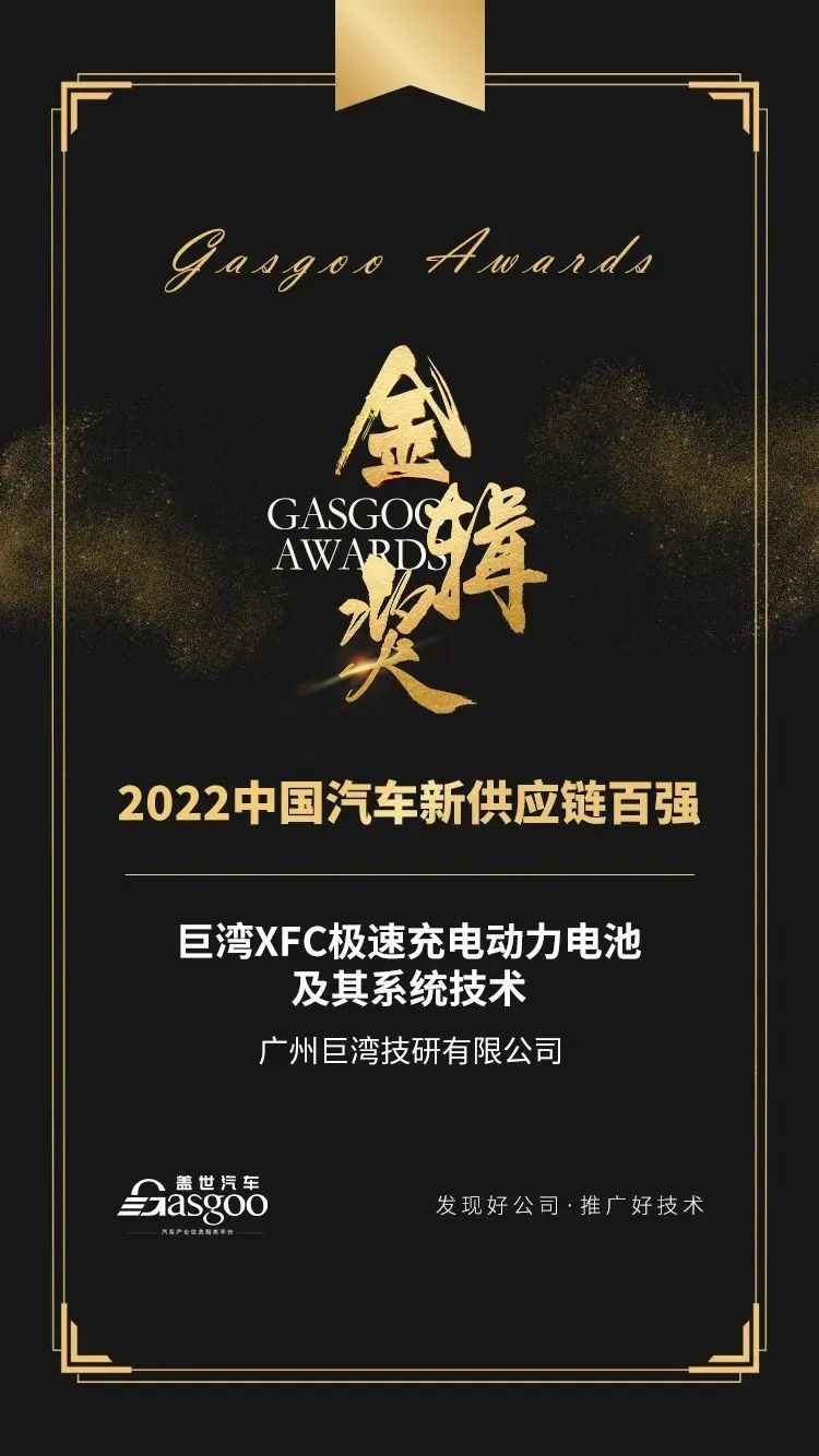 10月26日,第四屆“金輯獎(jiǎng)”中國(guó)汽車新供應(yīng)鏈百?gòu)?qiáng)頒獎(jiǎng)典禮在上海盛大開(kāi)幕。在來(lái)自電池行業(yè)內(nèi)眾多知名企業(yè)及供應(yīng)商的近千項(xiàng)創(chuàng)新產(chǎn)品中,南粵基金投資企業(yè)——廣州巨灣技研有限公司(簡(jiǎn)稱“巨灣技研”) “XFC極速充電技術(shù)”憑借行業(yè)領(lǐng)先的技術(shù)實(shí)力及應(yīng)用前景脫穎而出,斬獲動(dòng)力總成電氣化領(lǐng)域“中國(guó)汽車新供應(yīng)鏈百?gòu)?qiáng)”稱號(hào)。