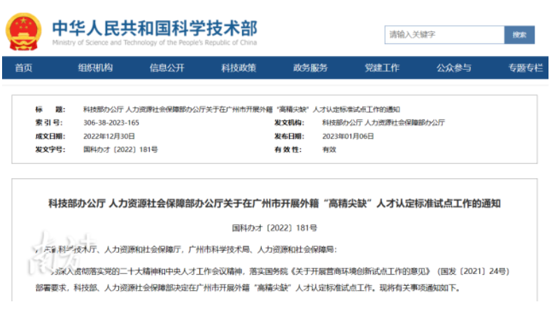 近日,科技部、人力資源社會保障部發(fā)布通知,在廣州市開展外籍“高精尖缺”人才認(rèn)定標(biāo)準(zhǔn)試點(diǎn)工作。廣州成為全國開展這項(xiàng)試點(diǎn)工作的首批六個城市之一。