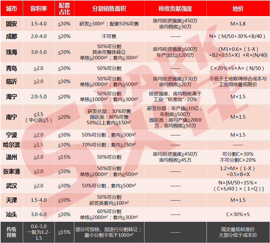 最后是地價(jià),基本上M1價(jià)格的1.5倍是底線,由于配套與研發(fā)辦公屬性增加,大部分也都加上了與跟商服用地掛鉤的部分,但總體來(lái)看,M0用地價(jià)格上并不貴,對(duì)于一個(gè)產(chǎn)業(yè)園區(qū)而言,只占成本的很小部分,更大的挑戰(zhàn)還在于招商門(mén)檻和稅收貢獻(xiàn)等。
