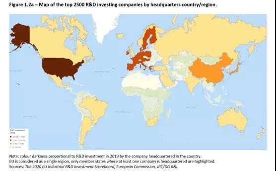 如果從地圖上看,則更加直觀,用顏色的深淺代表研發(fā)支出,可以看出就是集中在美國,歐洲和東亞三大區(qū)域。