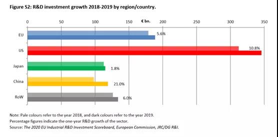 2019年的研發(fā)支出增長速度,美國10.8%,歐盟5.6%,中國21%,日本1.8%,RoW(全球其他國家)增長6.0%。