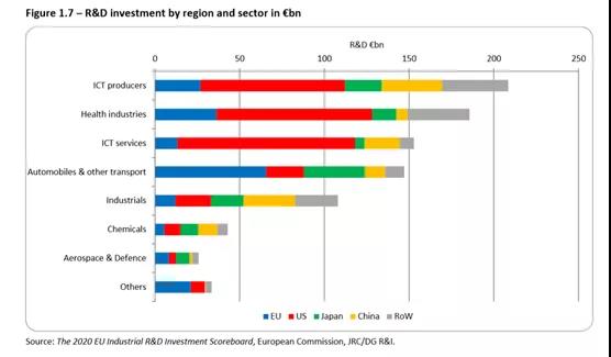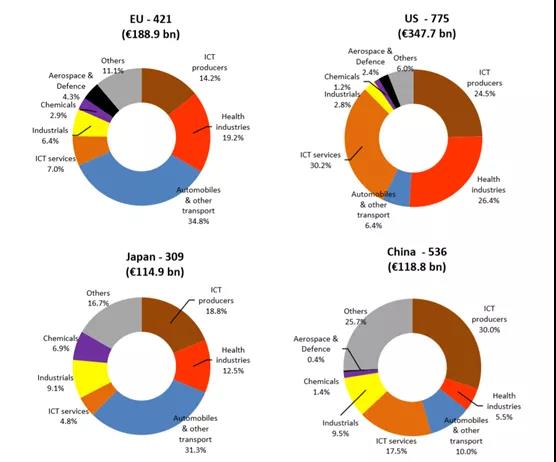 其他的主要產(chǎn)業(yè)還有化工,航空航天,冶金和設(shè)備制造業(yè),但是研發(fā)支出完全無法和上述的四個(gè)產(chǎn)業(yè)相比,最高的也就是494億歐元。