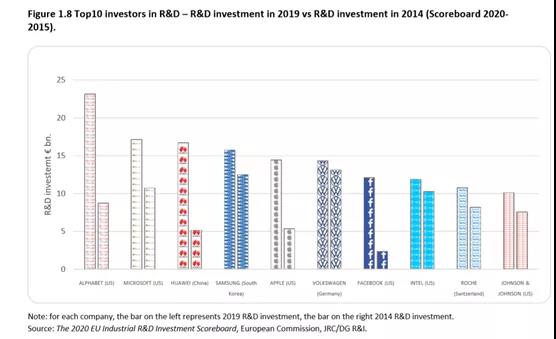 這些公司和2014年的研發(fā)投入對(duì)比,可以看出臉書,華為,蘋果,Alphabet,微軟等ICT公司增幅明顯更大,而大眾,羅氏,強(qiáng)生這樣的汽車和醫(yī)藥公司研發(fā)支出增幅相對(duì)較小。