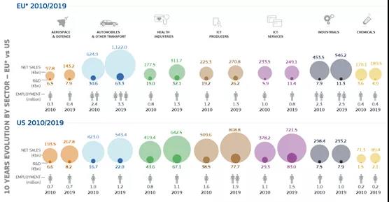 可以看出,歐洲2019年比2010年?duì)I收有明顯增幅的,主要是汽車行業(yè),醫(yī)療行業(yè)和航空航天產(chǎn)業(yè),其中歐洲的投資增量最大是在汽車產(chǎn)業(yè),醫(yī)療和航空航天也有較大增幅,但是基數(shù)較小,另外可以看出歐洲在ICT產(chǎn)業(yè)方面確實(shí)發(fā)展較慢,落后于中美。