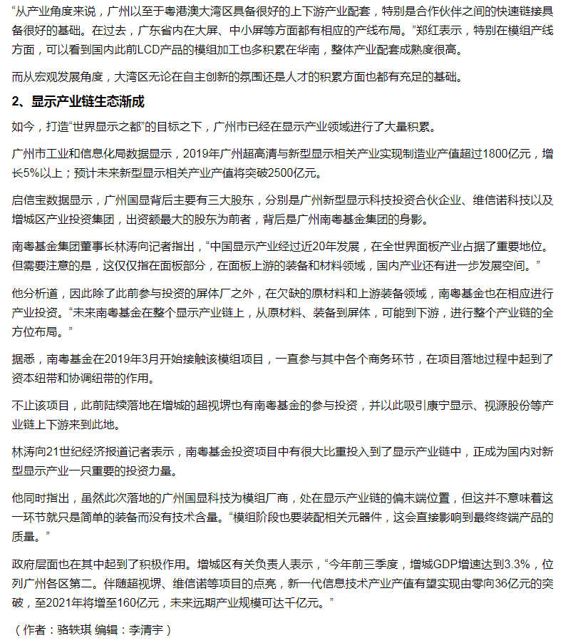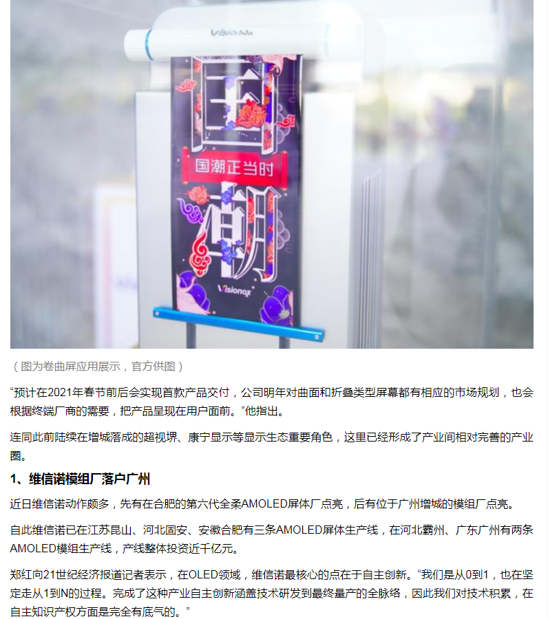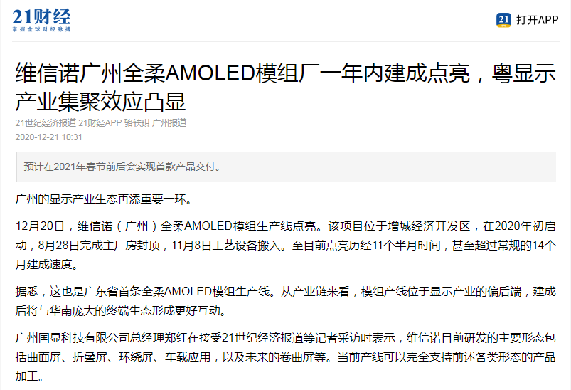 21財經(jīng)|維信諾廣州全柔AMOLED模組廠一年內(nèi)建成點亮,粵顯示產(chǎn)業(yè)集聚效應(yīng)凸顯