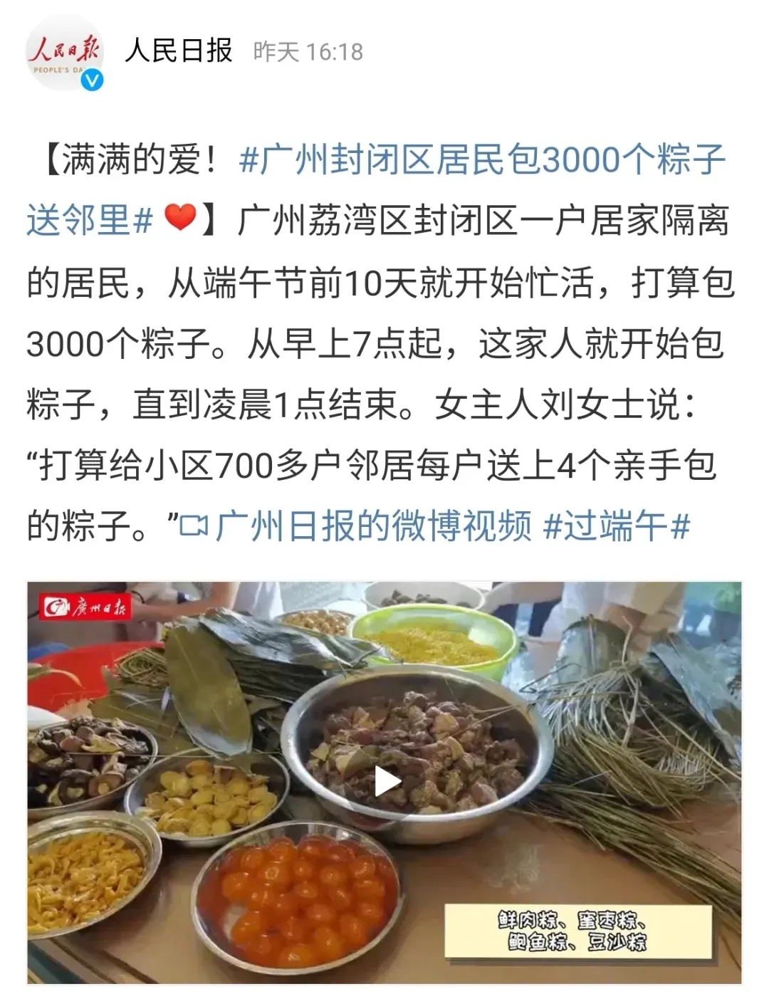 時值端午佳節(jié),因新冠疫情,廣州不少地方正處于封閉狀態(tài),在廣州本輪疫情感染者逐漸減少,風(fēng)險范圍日趨局限的情況下,疫情封控區(qū)市民吃上一口熱氣騰騰的粽子,過個特殊卻溫馨的端午節(jié),對于提振市民的信心頗為重要。