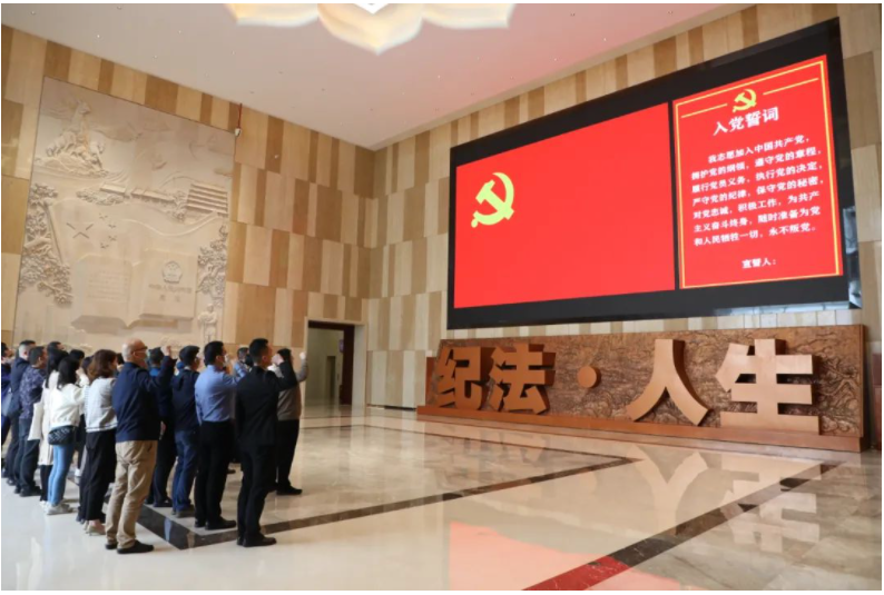 “我志愿加入中國共產(chǎn)黨,擁護(hù)黨的綱領(lǐng),遵守黨的章程……”在鮮紅的黨旗前,全體人員整齊列隊,莊嚴(yán)肅立,重溫入黨誓詞,隨后依次參觀了“源流紀(jì)法”“正視紀(jì)法”“知行紀(jì)法”“鏡鑒紀(jì)法”“尊崇紀(jì)法”“抉擇紀(jì)法”等六大展區(qū),在正面典型和反面警示的鮮明對比中,黨員干部深入了解中華紀(jì)法文化源遠(yuǎn)流長,深刻感悟中國共產(chǎn)黨推進(jìn)紀(jì)法建設(shè),扎緊制度藩籬歷久彌堅,銘記時刻保持對紀(jì)法的敬畏心,堅決做到廉潔從業(yè),警鐘長鳴。